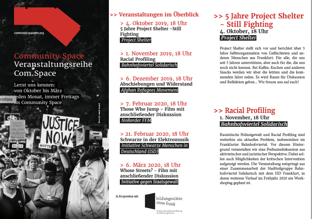 Project Shelter stellt sich vor und berichtet über 5 Jahre Selbtsorganisation von Geflüchteten und anderen Menschen aus Frankfurt. Für alle, die uns seit 5 Jahren unterstützen, aber auch für die, die uns noch nicht kennen. Bei Kaffee, Kuchen und anderen Snacks werden wir über die letzten und die kommenden Jahre reden. Es wird Raum für Diskussion und Reflektion geben… Wir freuen uns auf euch!